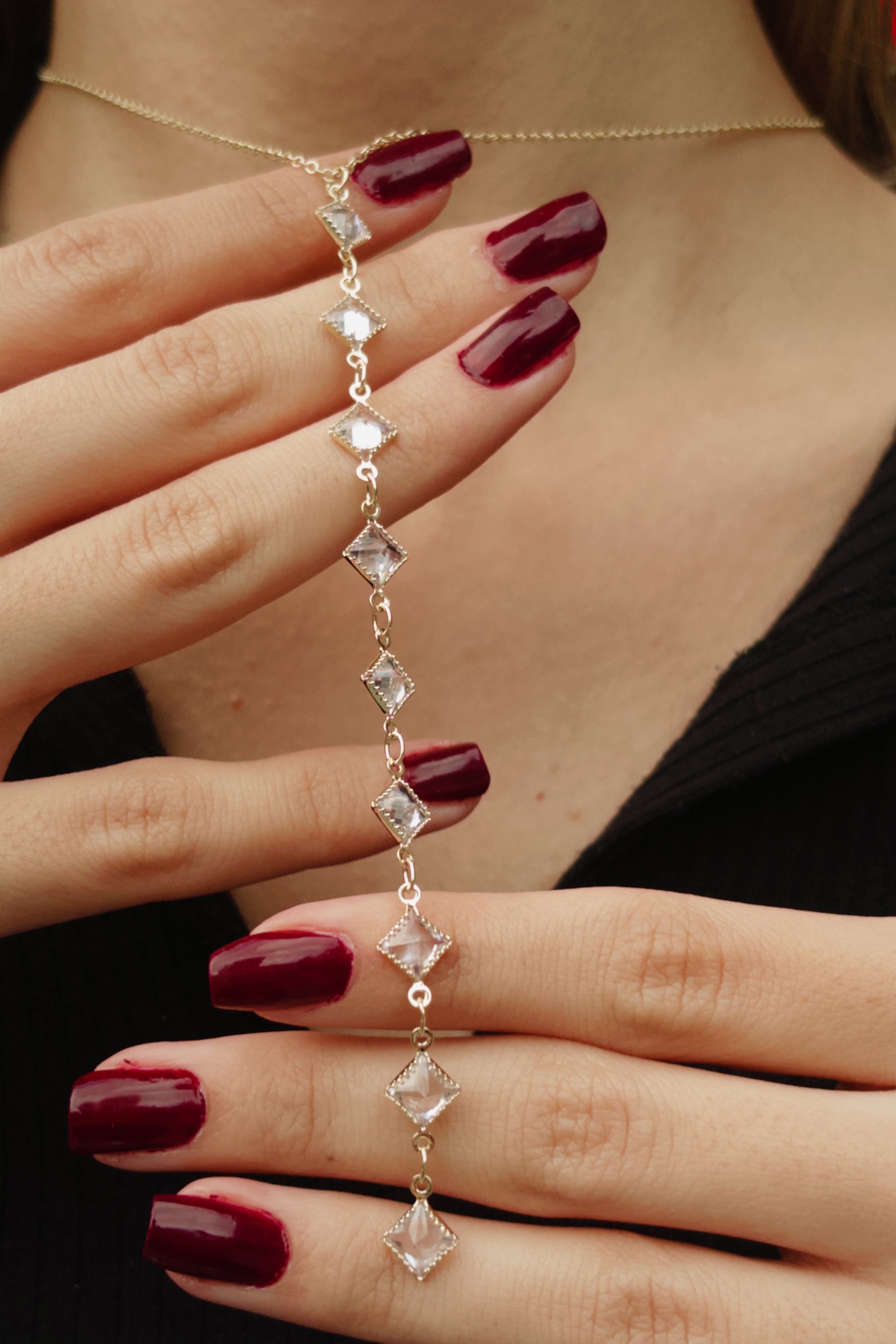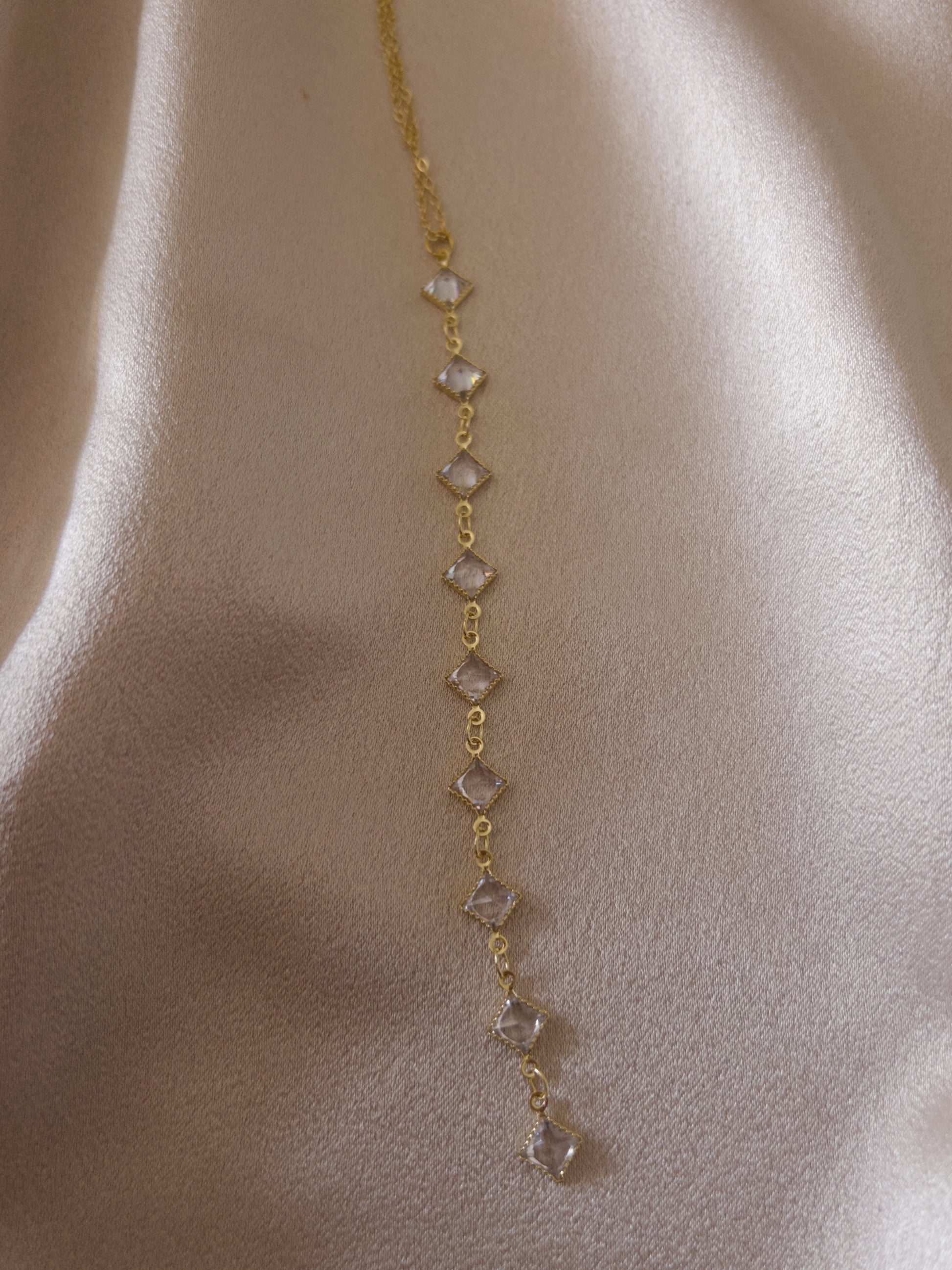 - Taşlı, desenli, altın rengi çelik kolye.